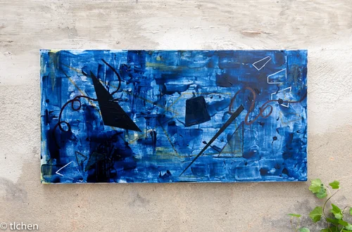 I used to doodle a lot during school. My favorite doodle was simply putting pen/pencil to paper and making stream-of-consciousness loops & angles in a continuous line. This was one of the pieces I tried to translate onto canvas. I was interested in how the forms and colours would relate to one another on the black canvas.